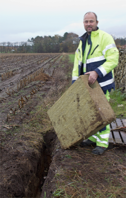 - Genbrugs-batts er kun 20 centimeter brede, så vi nøjes vi med at grave to 15 meter lange smalle render med en meters mellemrum. Her sætter vi genbrugsbatts i forlængelse af hinanden. Tilsammen fylder battsene kun 3,6 kubikmeter, og de giver samme volumen som det konventionelle nedsivningsanlæg med den store opgravning. Vi kan etablere et nedsivningsanlæg med genbrugs-batts i løbet af en dag, forklarer Verner H. Kristiansen.